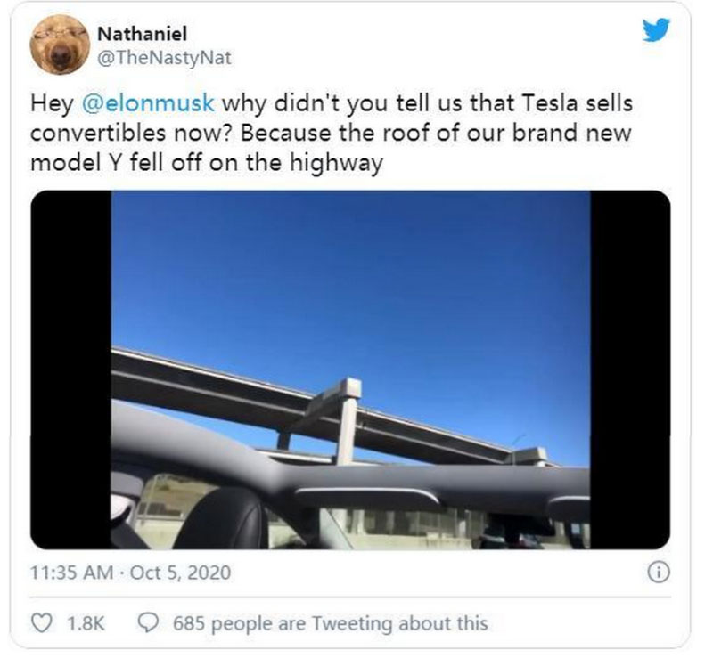 “老伙計(jì),你咋沒(méi)告訴我們還有敞篷版的 Model Y 可以選購(gòu)呢?我家剛買(mǎi)的 Model Y 新車(chē),它的頂棚剛剛在公路上馳騁時(shí)被吹飛了!”