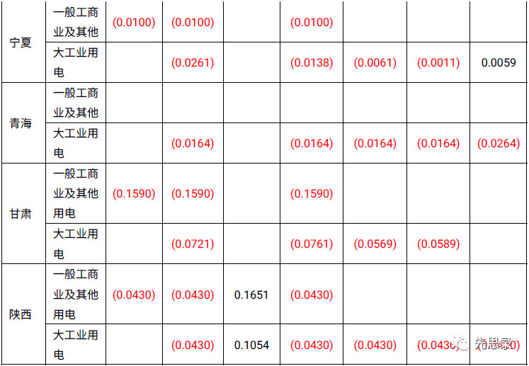 輸配電價的電壓級差方面。陜西的各類用電輸配電價電壓級差沒有變化;寧夏大工業(yè)用電輸配電價電壓級差除10千伏外,均有所增加,在5厘到1.2分左右;青海輸配電價的電壓級差基本沒有調(diào)整;甘肅一般工商業(yè)及其他不足1千伏的輸配電價降低了0.159元/千瓦時,大工業(yè)用電10千伏的輸配電價級差每千瓦時降低了7.2分。
