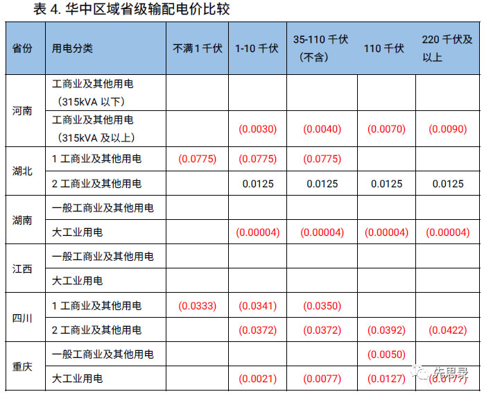 電度電價方面。湖北的兩部制電價各電壓等價均有所提高;湖南和河南一般工商業(yè)及其他電價、江西所有類型用戶電價未變化;四川各類用電輸配電價均有所下降;重慶大工業(yè)用電各電壓等級輸配電價均下調(diào)。