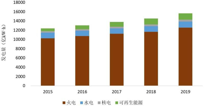 印度發(fā)電量持續(xù)上漲,近5年增速保持在5%以上,可再生能源發(fā)電占比快速提升。2019財年,印度發(fā)電量15632.0億kW?h,同比增長7.74%。其中火電機組仍是最大發(fā)電量來源,同比增長7.80%,在總發(fā)電量中占比80.13%;可再生能源發(fā)電量同比增長6.03%,發(fā)電量占比達到8.68%。2015-2019年印度不同類型裝機發(fā)電量如圖4所示。