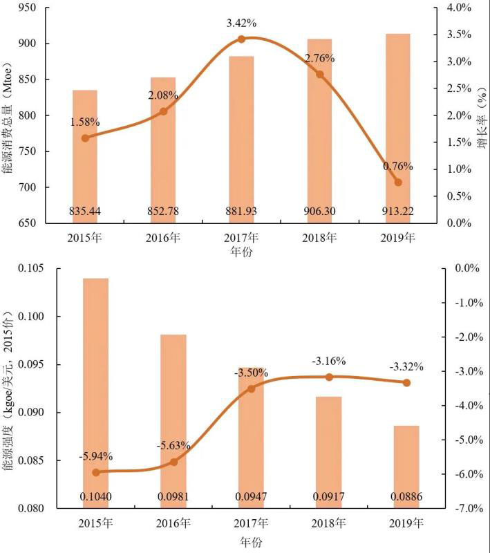印度能源消費增速明顯下降,能源強度繼續(xù)保持下降趨勢。2019年能源消費總量為913.22Mtoe,同比增長0.76%,增速同比下降2個百分點。印度大力發(fā)展可再生能源,能源結(jié)構(gòu)不斷改善,2019財年能源強度降至0.089kgoe/美元(2015年價)。2015-2019年印度能源消費總量、強度如圖2所示。