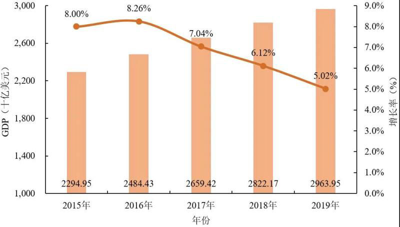 印度經(jīng)濟增速自2016年達到峰值后逐步放緩。2019年GDP為2.96萬億美元,GDP增速降至5.02%;人均GDP為2169.1美元,同比增長4.0%,僅為全球人均GDP的20%。2015-2019年印度GDP及其增長率如圖1所示。