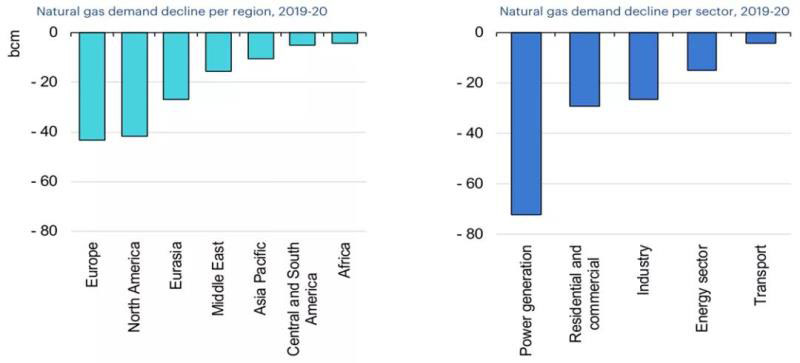 受新冠肺炎疫情全球蔓延影響,截至2020年6月初,全球主要天然氣市場都出現(xiàn)了不同程度的需求下降或增長放緩。IEA在其6月發(fā)布的《2020年天然氣報告》中指出,整個2020年,全球各個部門天然氣消費量都將下降,且發(fā)電部門所受影響最為嚴(yán)重(見圖2)。因疫情原因?qū)嵤┑牡貐^(qū)封鎖措施導(dǎo)致用電量減少,已經(jīng)對天然氣發(fā)電造成嚴(yán)重沖擊。受電力需求下降和可再生能源發(fā)電增長的雙重影響,天然氣發(fā)電在歐洲受到的沖擊尤其嚴(yán)重。在除中東以外的新興市場,天然氣發(fā)電在電力結(jié)構(gòu)中占比較低,受到的影響相對較小。IEA的最新預(yù)測顯示,2020年全球發(fā)電用天然氣需求將同比下降約7%,占全球天然氣需求下降的60%左右。