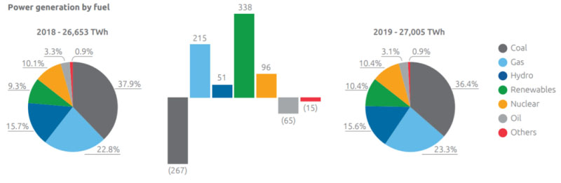 具體到地區(qū)/國家層面,2019年全球天然氣發(fā)電量增量主要來自美國、中國和歐洲地區(qū)。其中,美國天然氣發(fā)電量1700.9太瓦時,同比增長121.6太瓦時,增幅7.7%;歐洲地區(qū)天然氣發(fā)電量768.1太瓦時,同比增長38.2太瓦時,增幅5.2%;中國天然氣發(fā)電量236.5太瓦時,同比增長21太瓦時,增幅9.7%。與2018年相比,中國天然氣發(fā)電量增長有所放緩。歐洲地區(qū)部分國家天然氣發(fā)電量的強(qiáng)勁增長受“煤改氣”帶動。在日本,2019年天然氣發(fā)電量362.4太瓦時,同比減少24.5太瓦時,降幅6.3%,主要原因是核能發(fā)電量增加和總體電力需求下降。