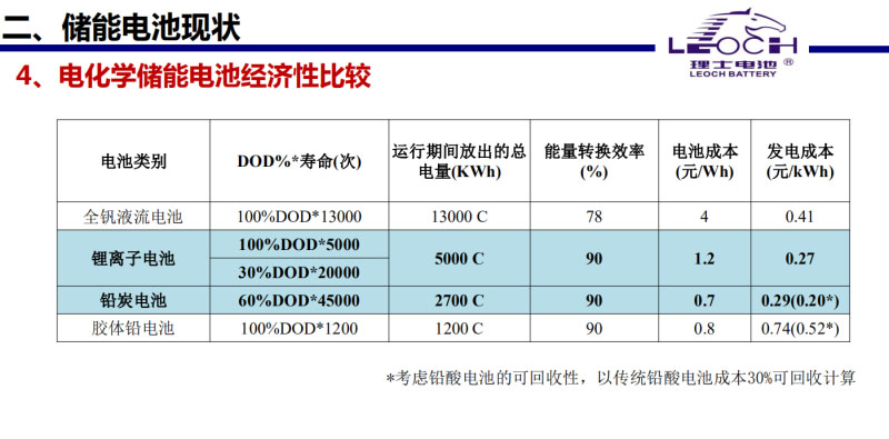這是從經(jīng)濟性上比較的,發(fā)電成本只是純電池,不包括系統(tǒng)。如果要算系統(tǒng),按最后的成本可能要乘2-3,也不包括充電。目前看來鋰離子電池和鉛炭電池有優(yōu)勢。鉛炭電池雖然慢慢被取代,但到目前為止還是唯一一個能夠循環(huán)利用的,其他的體系的電池還都做不到,所以它還仍然有生命力。