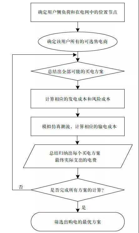 在交易開始前,先確定用戶的負荷需求及其在電網(wǎng)中的具體位置,根據(jù)位置確定潛在可選擇的發(fā)電商,推導出可能的交易策略。為了篩選出經(jīng)濟最佳方案,需要分別模擬每種策略的發(fā)電成本、風險成本和輸電成本。發(fā)電成本通過綜合所選發(fā)電商的發(fā)電成本和相應采購量計算。風險成本需要確定所選發(fā)電商是否存在可再生能源,并根據(jù)其相應的采購量計算。輸電成本需先仿真電路潮流,在相應線路潮流的基礎上綜合整合而得。