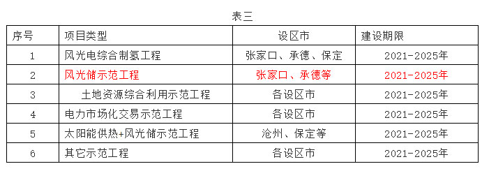 依據(jù)《河北省風(fēng)電光伏發(fā)電資源規(guī)劃》,統(tǒng)籌謀劃,科學(xué)制定風(fēng)電、光伏發(fā)電“十四五”發(fā)展規(guī)劃,加強(qiáng)與國(guó)土空間規(guī)劃,電網(wǎng)建設(shè)規(guī)劃有機(jī)銜接,結(jié)合風(fēng)電、光伏發(fā)電行業(yè)前沿技術(shù)和新發(fā)展理念,謀劃打造一批綜合應(yīng)用示范工程(見(jiàn)表三),一是風(fēng)光電綜合制氫示范工程。結(jié)合風(fēng)電、光伏發(fā)電技術(shù)進(jìn)步和成本下降,依托張家口、承德、保定等市氫能產(chǎn)業(yè)基礎(chǔ)和特色優(yōu)勢(shì),合理布局風(fēng)電、光伏發(fā)電制氫項(xiàng)目,探索新能源發(fā)電與電解水制氫一體化技術(shù),有效降低制氫成本的同時(shí),提升電網(wǎng)風(fēng)光電就地消納能力。二是風(fēng)光儲(chǔ)示范工程。支持風(fēng)電、光伏發(fā)電項(xiàng)目按10%左右比例配套建設(shè)儲(chǔ)能設(shè)施,開(kāi)展超級(jí)電容儲(chǔ)能、超導(dǎo)儲(chǔ)能、先進(jìn)電池儲(chǔ)能、壓縮空氣儲(chǔ)能等先進(jìn)儲(chǔ)能技術(shù)示范應(yīng)用,著力提升風(fēng)電、光伏發(fā)電并網(wǎng)友好型。三是土地資源綜合利用示范工程。鼓勵(lì)光伏發(fā)電項(xiàng)目開(kāi)發(fā)與農(nóng)業(yè)、牧業(yè)、漁業(yè)等深度結(jié)合,開(kāi)展光伏+農(nóng)、林、牧、漁綜合利用,提高土地利用效率。四是電力市場(chǎng)化交易示范工程。鼓勵(lì)風(fēng)電、光伏發(fā)電項(xiàng)目與大數(shù)據(jù)等高科技產(chǎn)業(yè)積極探索大用戶直供和分布式市場(chǎng)化交易模式,促進(jìn)綠色電力直接交易機(jī)制創(chuàng)新。