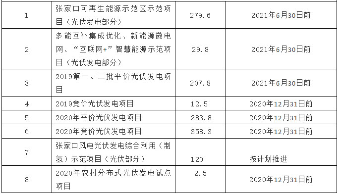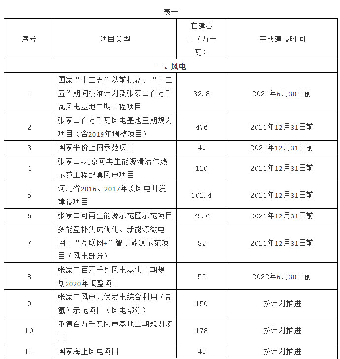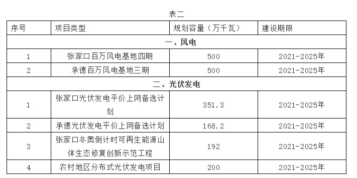 加快推進(jìn)在建項(xiàng)目建設(shè)的同時(shí),結(jié)合張北500KV柔性直流,張北-雄安1000KV特高壓電網(wǎng)通道運(yùn)行情況,在落實(shí)土地條件、電網(wǎng)消納送出條件的前提下,有序啟動(dòng)儲(chǔ)備項(xiàng)目(見(jiàn)表二)建設(shè),一是以張家口、承德壩上地區(qū)為重點(diǎn),適時(shí)啟動(dòng)張家口百萬(wàn)千瓦風(fēng)電基地四期和承德百萬(wàn)千瓦風(fēng)電基地三期規(guī)劃工作。二是對(duì)張家口、承德光伏發(fā)電平價(jià)上網(wǎng)備選計(jì)劃51個(gè)、519.5萬(wàn)千瓦、張家口市冬奧倒計(jì)時(shí)山體修復(fù)示范創(chuàng)新11個(gè)、192萬(wàn)千瓦項(xiàng)目統(tǒng)籌推進(jìn)建設(shè)。三是完成5000戶、2.5萬(wàn)千瓦農(nóng)村地區(qū)分布式光伏發(fā)電試點(diǎn)項(xiàng)目基礎(chǔ)上,加快技術(shù)進(jìn)步,降低設(shè)備成本,完善建設(shè)模式,在全省具備條件的地區(qū)分期分批逐步實(shí)施。