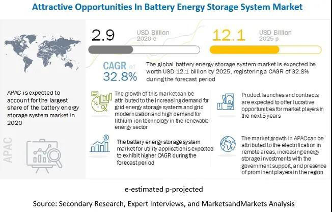 國際市場研究機構Markets and Markets日前發(fā)布的報告稱,2020年全球電池儲能系統(tǒng)市場規(guī)模預計將達到29億美元,到2025年,這一數(shù)據(jù)有望增至121億美元,期間年復合增長率達到32.8%。
