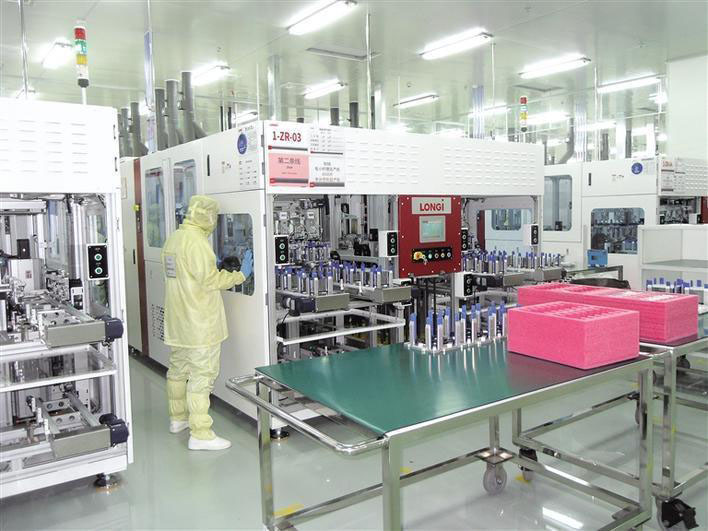 工人在隆基股份子公司——西安隆基樂葉光伏科技有限公司太陽能光伏電池生產(chǎn)線上生產(chǎn)。記者 沈謙攝