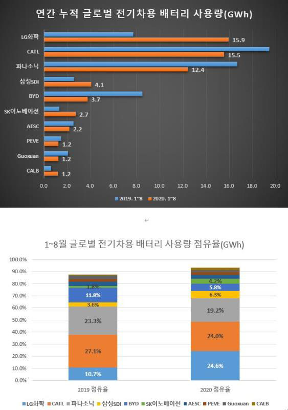 根據(jù)韓國調(diào)查機構SNE Research的數(shù)據(jù),2020年1-8月全球動力電池使用量較去年同期萎縮9.9%至64.7GWh,其中LG化學以24.6%(15.9GWh)的市占率居冠,寧德時代以24%(15.54GWh)的市占率緊追在后,松下以19.2%的市占率排第三,韓國三星SDI(6.3%)、比亞迪(5.8%)和韓國SK Innovation(4.2%)則順列第四至第六位。