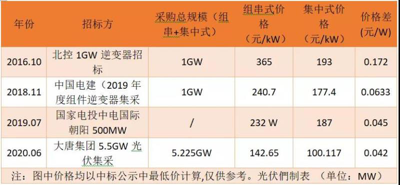 如上文所述,從集中式與組串式逆變器的價(jià)格來(lái)看,二者價(jià)差正逐步縮小,尤其是近五年,多次逆變器格局變動(dòng)和531政策以及海外市場(chǎng)的激烈競(jìng)爭(zhēng)等因素給逆變器的價(jià)格競(jìng)爭(zhēng)帶來(lái)了持續(xù)的壓力。光伏們對(duì)比了2012-2020年的重點(diǎn)招標(biāo)項(xiàng)目,其中對(duì)中標(biāo)候選人或者中標(biāo)公示人的逆變器價(jià)格進(jìn)行了對(duì)比,可以發(fā)現(xiàn),集中式與組串式逆變器的價(jià)差正由2016年的0.17元/瓦逐漸縮小至不足5分錢。
