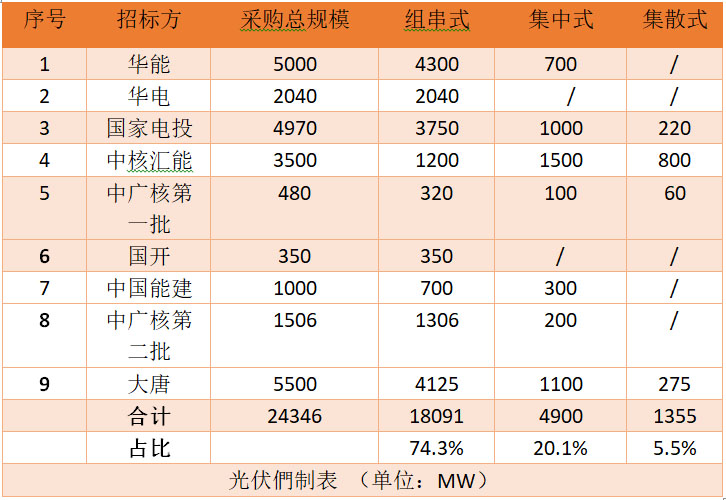 光伏們統(tǒng)計(jì)了2020年上半年的電力央企招標(biāo),在共計(jì)24.3GW的招標(biāo)中,組串式容量超過(guò)了18GW,占總招標(biāo)容量的74.3%。