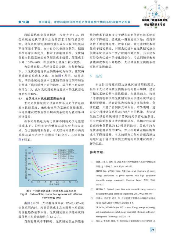 結論:本文針對青藏高原邊遠地區(qū)清潔用能需求,提出了光伏儲氫獨立供能系統(tǒng)的基本架構,建立了儲氫系統(tǒng)的熱電聯(lián)供模型。在此基礎上,構建了考慮熱電聯(lián)供的光伏儲氫獨立供能系統(tǒng)容量優(yōu)化配置模型。結合青海邊遠農牧區(qū)實際光伏、負荷數據,開展了算例仿真和分析。結果表明,通過充分利用儲氫系統(tǒng)運行時產生的熱能,光伏儲氫獨立供能系統(tǒng)相較于傳統(tǒng)的光伏蓄電池系統(tǒng),可有效降低農牧區(qū)清潔供能成本。其相對經濟效益在熱電負荷比約1.3時達到最佳,總成本約為光伏蓄電池系統(tǒng)的87%,并且相對效益隨新能源成本下降而提升。本文的研究工作對青藏高原邊遠地區(qū)基于清潔能源獨立供能的系統(tǒng)建設提供了新的思路。