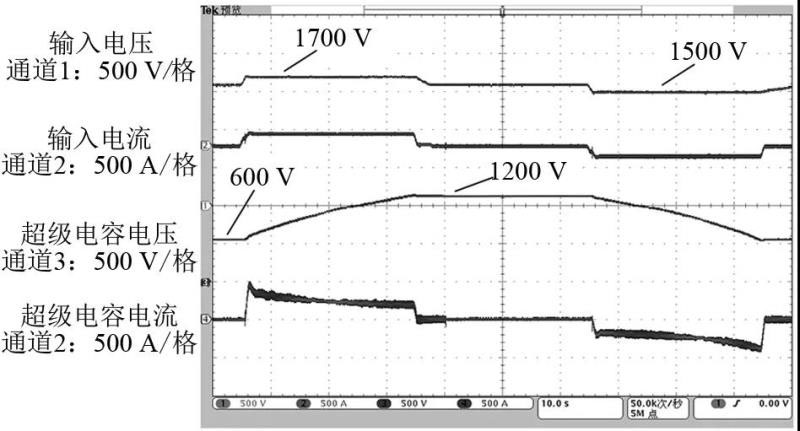 由于試驗(yàn)條件的限制,利用容量為500 kW的PWM整流器作為列車模擬源,測(cè)試儲(chǔ)能裝置的充放電特性,試驗(yàn)波形如圖5所示。PWM整流器設(shè)定為功率源特性,以發(fā)出500 kW功率模擬列車制動(dòng)工況,儲(chǔ)能裝置檢測(cè)到直流電壓升高到1700 V時(shí)進(jìn)入降壓斬波模式,超級(jí)電容的電壓從初始電壓600 V充電至1200 V;再以吸收500 kW功率模擬列車牽引工況,儲(chǔ)能裝置檢測(cè)到直流電壓降低到1500 V時(shí)進(jìn)入升壓斬波模式,超級(jí)電容的電壓從初始1200 V放電至600 V。