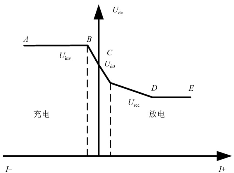 儲(chǔ)能裝置的控制特性需考慮與整流機(jī)組和列車的配合,如圖4所示,CD段為整流機(jī)組外特性曲線,ABC段為儲(chǔ)能裝置充電特性曲線、DE段為放電特性曲線。