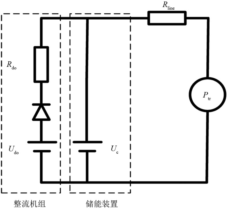 儲(chǔ)能裝置與整流機(jī)組、列車共同組成了電源-負(fù)荷系統(tǒng),儲(chǔ)能裝置應(yīng)選擇合適的控制策略,確保:①列車制動(dòng)時(shí),儲(chǔ)能裝置為超級(jí)電容組充電、同時(shí)整流機(jī)組退出運(yùn)行;②列車牽引時(shí),儲(chǔ)能裝置將超級(jí)電容組中的電能釋放出來(lái)、與整流機(jī)組共同為列車提供牽引能量。避免發(fā)生儲(chǔ)能裝置從整流機(jī)組抽取能量,或超級(jí)電容組的能量未及時(shí)釋放而導(dǎo)致列車再次制動(dòng)時(shí)無(wú)法吸收再生能量。