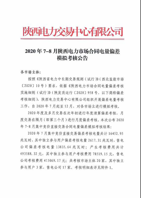2020年7-8月陜西電力市場合同電量偏差模擬考核公告
