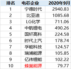 2020年9月中國市場動(dòng)力電池裝機(jī)量TOP10