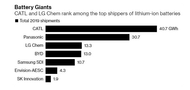寧德時(shí)代和LG化學(xué)是鋰離子電池的主要供應(yīng)商之一。(圖片來源:彭博社)