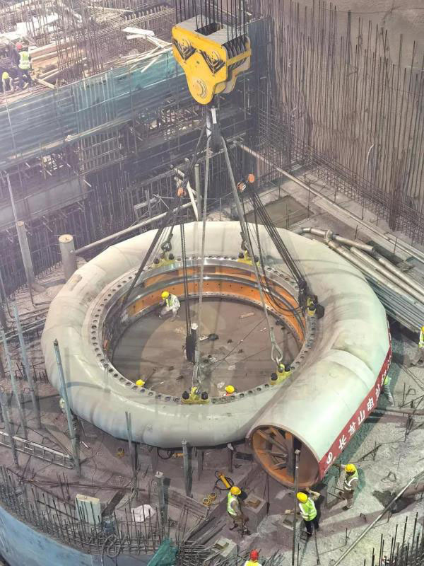 5月28日,長(zhǎng)龍山抽水蓄能電站4號(hào)機(jī)蝸殼座環(huán)順利吊裝完成,標(biāo)志著東方電機(jī)研制的國內(nèi)最高水頭抽水蓄能機(jī)組蝸殼座環(huán)全部吊裝完成。