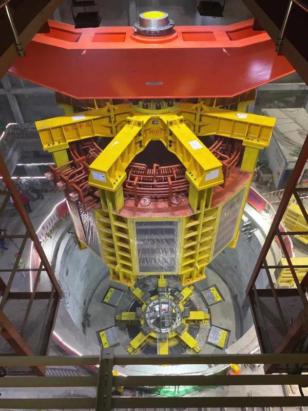 據(jù)東方電機(jī)現(xiàn)場(chǎng)服務(wù)人員介紹,轉(zhuǎn)子是抽水蓄能發(fā)電電動(dòng)機(jī)重要部件。東方電機(jī)研制的長(zhǎng)龍山500轉(zhuǎn)/分鐘、35萬千瓦發(fā)電電動(dòng)機(jī),轉(zhuǎn)子采用一根軸、整圓磁軛結(jié)構(gòu),整體高10.9米,直徑4.7米,整體起吊重量約413噸(不含吊具),是機(jī)組安裝過程中單件起吊重量最大的關(guān)鍵核心部件。