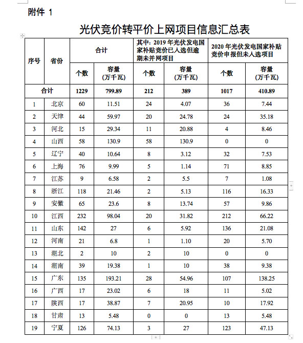 國(guó)家能源局綜合司關(guān)于公布光伏競(jìng)價(jià)轉(zhuǎn)平價(jià)上網(wǎng)項(xiàng)目的通知