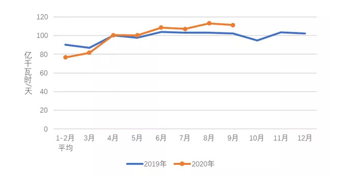 圖1 2019、2020年分月全社會(huì)用電量及其增速