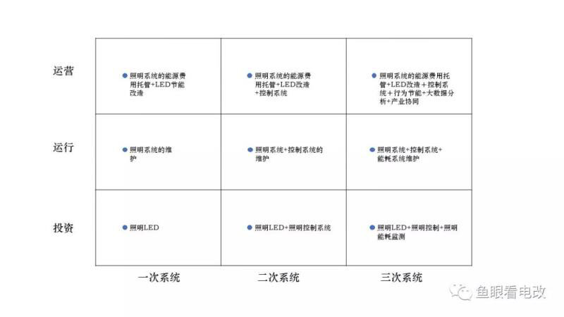 我認(rèn)為綜合能源服務(wù)未來真正有價(jià)值的商業(yè)模式,是包含設(shè)備改造(非單純投資,或者投資運(yùn)營分離)、二次系統(tǒng)(比如燈控、門禁聯(lián)動(dòng)等)、三次系統(tǒng)(能源數(shù)據(jù)分析)的,并且是一種投資+運(yùn)行維護(hù)+運(yùn)營收費(fèi)托管的復(fù)雜商業(yè)模式。