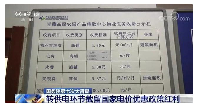 在西寧市青藏高原農(nóng)副產(chǎn)品集散中心,督查組看到物業(yè)服務(wù)收費(fèi)公示欄顯示,商鋪繳納的電費(fèi)標(biāo)準(zhǔn)是每度1.2元,由0.53元的電度電價(jià)和0.67元的公共設(shè)施用電及損耗費(fèi)兩部分組成。而《中華人民共和國(guó)電力法》規(guī)定,任何單位和個(gè)人禁止在電費(fèi)中加收其他費(fèi)用。督查組調(diào)查發(fā)現(xiàn),該集散中心從電網(wǎng)企業(yè)的最新購(gòu)電均價(jià)僅為0.48元/度,而供給商戶(hù)卻收取1.2元/度,加價(jià)幅度達(dá)到了150%。督查組走訪(fǎng)了部分商戶(hù),均反映集散中心一直按每度1.2元的標(biāo)準(zhǔn)收電費(fèi),自2018年以來(lái)從來(lái)沒(méi)有降過(guò)價(jià),沒(méi)有將國(guó)家連續(xù)3年實(shí)施的降電價(jià)政策紅利及時(shí)足額傳導(dǎo)下去。