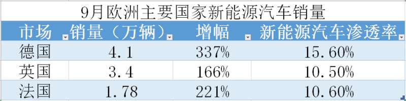 據(jù)歐洲汽車制造業(yè)聯(lián)盟(AECA)最新數(shù)據(jù)顯示,9月,德國、英國、法國、挪威、瑞典、葡萄牙、意大利、瑞士、西班牙等九國新能源汽車銷量持續(xù)走高,注冊量合計約為13.3萬輛,同比上升195%。