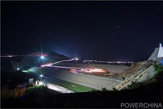 下水庫大壩為混凝土面板堆石壩,1級建筑物。正常蓄水位319米,大壩壩頂長375米,最大壩高49米。大壩于5月截流、10月實(shí)現(xiàn)封頂,歷時5個月完成施工任務(wù)。大壩填筑完成標(biāo)志著左右岸連接的壩頂公路即將貫通,為日后的施工提供便捷條件。