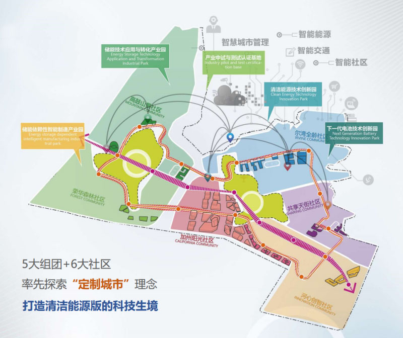 依托四大產(chǎn)業(yè)圈層,針對不同城市空間需求,中糧·眉山加州智慧城規(guī)劃了功能高度定制的五大類城市功能組團(tuán),分別是:儲能技術(shù)應(yīng)用與轉(zhuǎn)化產(chǎn)業(yè)園、清潔能源技術(shù)創(chuàng)新園、產(chǎn)品中試與測試認(rèn)證基地、下一代電池技術(shù)創(chuàng)新園、儲能依賴型智能制造產(chǎn)業(yè)園。結(jié)合五大功能組團(tuán),布局六大能量社區(qū),組團(tuán)內(nèi)產(chǎn)城融合,組合間協(xié)同高效。