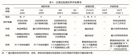 過熱測(cè)試(也稱為快速充電/放電、過熱保護(hù)測(cè)試)旨在評(píng)估溫度控制故障或其他保護(hù)功能故障時(shí)對(duì)電池發(fā)生內(nèi)部過熱的影響。表6列出了標(biāo)準(zhǔn)和法規(guī)的測(cè)試參數(shù)。