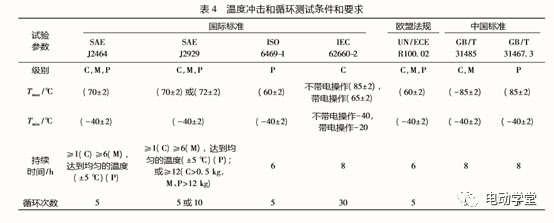 此試驗(yàn)主要評(píng)估由于暴露于極端和突然的溫度變化(例如,在運(yùn)輸過程中車輛進(jìn)入或離開加熱或冷凍的車庫時(shí),導(dǎo)致電池組件的膨脹和收縮)而引起的DUT完整性的變化。在溫度沖擊和循環(huán)試驗(yàn)期間,DUT會(huì)經(jīng)受高溫和低溫兩個(gè)溫度限值,并在每個(gè)溫度限值下保持指定的時(shí)間。標(biāo)準(zhǔn)和法規(guī)中描述的溫度沖擊和循環(huán)測(cè)試具有不同的最高溫度限制(請(qǐng)參見表4)。所有標(biāo)準(zhǔn)和法規(guī)的溫度下限均為-40°C(IEC62660-2在帶電操作情況,是最低溫度為-20℃),盡管溫度上限不相同。