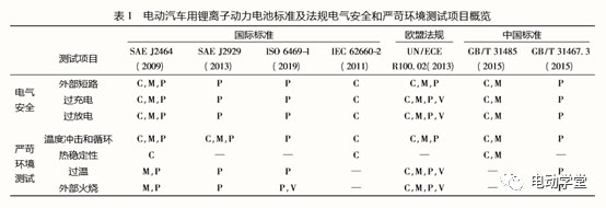 動(dòng)力鋰離子電池必須通過一系列安全測(cè)試,才能在電動(dòng)汽車上應(yīng)用。這些安全測(cè)試是為了解和識(shí)別電池在非正常狀況時(shí)的潛在弱點(diǎn)和脆弱性,并確定電池在嚴(yán)酷的惡劣條件下的表現(xiàn)。由于篇幅所限,本文作者僅對(duì)國(guó)內(nèi)外電動(dòng)汽車動(dòng)力鋰離子電池電氣安全和嚴(yán)苛環(huán)境測(cè)試的標(biāo)準(zhǔn)及法規(guī)進(jìn)行了分析和歸納,對(duì)標(biāo)準(zhǔn)中存在的問題進(jìn)行了探討。