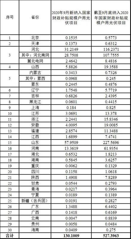 根據(jù)各省級能源主管部門、電網(wǎng)企業(yè)報送信息,經(jīng)國家可再生能源信息管理中心梳理統(tǒng)計,2020年9月新納入國家財政補貼規(guī)模戶用光伏項目總裝機容量為130.1萬千瓦。截至2020年9月底,全國累計納入2020年國家財政補貼規(guī)模戶用光伏項目裝機容量為527.4萬千瓦。詳細情況見附表。