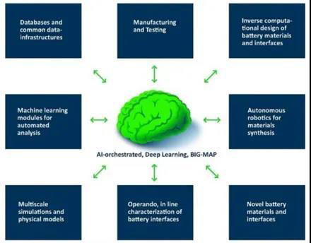 從能源技術(shù)的生產(chǎn),存儲(chǔ)到最終交付使用,材料的發(fā)現(xiàn)和開發(fā)始終貫穿于整個(gè)過程。特別對(duì)于新興的電池技術(shù),先進(jìn)材料幾乎是所有清潔能源創(chuàng)新的基礎(chǔ)。若依靠現(xiàn)有的傳統(tǒng)重復(fù)性試驗(yàn)開發(fā)過程,需要耗費(fèi)大量的時(shí)間,人力物力去開發(fā)新型高性能電池材料并用于電池設(shè)計(jì),這一過程從最初發(fā)現(xiàn)到完全實(shí)現(xiàn)商業(yè)化可能長(zhǎng)達(dá)10年之久。因此,在《電池2030+》項(xiàng)目中,為了加速超高性能的,可持續(xù)發(fā)展的智能型電池開發(fā),計(jì)劃在歐洲范圍內(nèi)設(shè)立電池“材料加速平臺(tái)(MAP)”,并與電池界面基因組(BatteryInterface Genome,BIG)集成在一起。同時(shí)BIG-MAP基礎(chǔ)設(shè)施模塊化設(shè)置,全系統(tǒng)具有高度的通用性,以便能夠容納所有新興的電池化學(xué)體系,材料成分,結(jié)構(gòu)和界面。另一方面,MAP將利用人工智能(AI)從許多互補(bǔ)的方法和技術(shù)中集成和編排數(shù)據(jù),整合計(jì)算材料設(shè)計(jì),模塊化和自主性綜合機(jī)器人技術(shù)和先進(jìn)表征,實(shí)現(xiàn)全新的電池開發(fā)策略。促進(jìn)材料,工藝和設(shè)備的逆向設(shè)計(jì)和定制。最終,在MAP框架下由每個(gè)核心元素構(gòu)建概念電池,開發(fā)出具有突破性的電池材料,極大提高電池開發(fā)速度和電池性能。