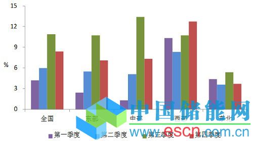 圖3 2013年各地區(qū)分季度全社會(huì)用電量增速情況圖