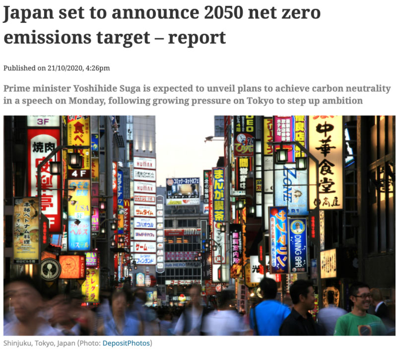 在中國(guó)上個(gè)月意外宣布中國(guó)將在2060年實(shí)現(xiàn)碳中和以及韓國(guó)今年早些時(shí)候的類(lèi)似計(jì)劃之后,日本面臨著澄清其長(zhǎng)期目標(biāo)的壓力。2050年的碳中和目標(biāo)確定之后,日本也必須修訂2030年能源規(guī)劃。根據(jù)現(xiàn)有的能源規(guī)劃,2030年可再生能源預(yù)計(jì)將提供22-24%的發(fā)電量,核能占22-20%,而煤炭、石油和天然氣仍占能源結(jié)構(gòu)的56%(煤電占至少還占26%)。