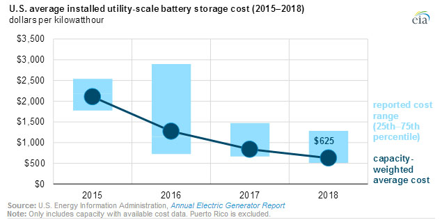 中國儲能網(wǎng)訊:根據(jù)美國能源信息管理局最近發(fā)布的《發(fā)電設(shè)施的年度報告》,美國電網(wǎng)規(guī)模電池儲能系統(tǒng)的平準(zhǔn)化成本已從2015年的2,152美元/kWh迅速降到2018年的625美元/kWh。電池儲能系統(tǒng)可以存儲由發(fā)電設(shè)施產(chǎn)生或直接從電網(wǎng)獲取的電力,然后根據(jù)需要重新分配電力。截至2018年底,美國已經(jīng)部署的電池儲能系統(tǒng)的裝機(jī)容量為869MW,儲能容量為1,236MWh。