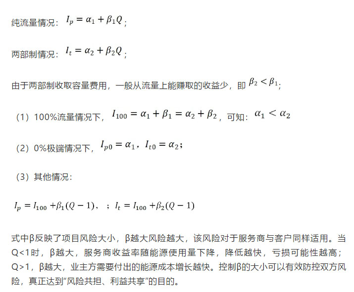區(qū)域能源業(yè)務(wù)最大的風(fēng)險點(diǎn)在于各種因素疊加導(dǎo)致實(shí)際用能量不及預(yù)期(這也是其他用戶側(cè)綜合能源項目的主要風(fēng)險點(diǎn)),而該風(fēng)險因素并不是由于服務(wù)商進(jìn)入而新增的,即便客戶自行投資,該風(fēng)險依然存在(計該部分風(fēng)險為R1),所以項目投資風(fēng)險由服務(wù)商一力承擔(dān)顯失公允。服務(wù)商利用其專業(yè)技術(shù)和管理,提升了客戶用能質(zhì)量和效率,也部分降低了上述風(fēng)險(風(fēng)險變?yōu)镽2 ,R2< R1)。這是服務(wù)商創(chuàng)造的價值,其價值通過高品質(zhì)的服務(wù)和更低的能源費(fèi)用由客戶分享(能源費(fèi)用從C1降低到 C2,C2< C1)。在“風(fēng)險共擔(dān)、利益共享”的原則下,客戶承擔(dān)部分風(fēng)險,跟自行投資相比,客戶風(fēng)險由R1降低到w*R2(0<w<1),同時能源費(fèi)用從C1降低到C2,獲得了明顯的效益。而服務(wù)商發(fā)揮專業(yè)優(yōu)勢,實(shí)現(xiàn)能源成本和項目風(fēng)險的雙降,獲得市場空間和合理收益。