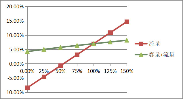 那么,具體到收費(fèi)模式上該怎樣設(shè)計?如圖3,橫坐標(biāo)為實(shí)際流量Q(按比例計,100%表示實(shí)際流量等于設(shè)計流量),縱坐標(biāo)為收益率I。在按純流量、容量+流量(兩部制)兩種收費(fèi)模式下,如流量達(dá)到設(shè)計值情況下收益率水平一致,I近似為Q的線性函數(shù)??傻茫?