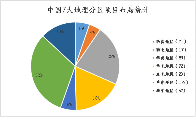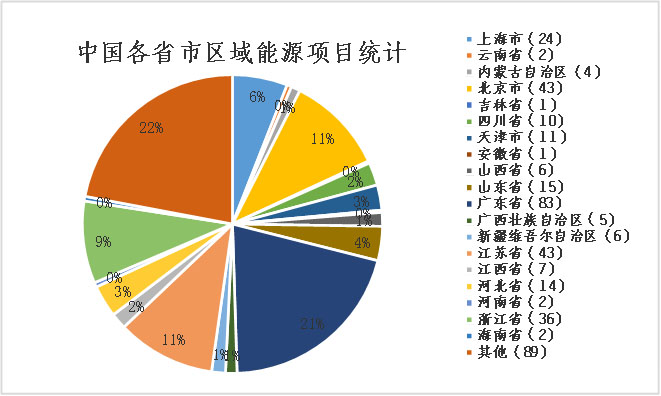圖1、圖2所示,已投運(yùn)區(qū)域能源項目主要分布在經(jīng)濟(jì)較為發(fā)達(dá)的華東、華南和華北地區(qū),其中經(jīng)濟(jì)強(qiáng)?。ㄊ校┮彩菂^(qū)域能源發(fā)展領(lǐng)先地區(qū),廣東、江蘇、北京、浙江、上海5省(市)項目總數(shù)占56.7%。