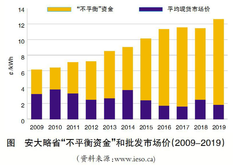 隨著優(yōu)先購電合同電量的增加、安省電力監(jiān)管方式的改變(比如用“優(yōu)先發(fā)電”替代“市場力控制協(xié)議”)以及安省現(xiàn)貨市場價格逐年下降,安省“優(yōu)先購電”和“優(yōu)先發(fā)電”價格與現(xiàn)貨市場價逐漸拉開,“不平衡資金”開始由盈轉虧,且規(guī)模越來越大。如下圖所示,在2009年,批發(fā)市場價為0.155元/千瓦時,不平衡資金約為0.16元/千瓦時。但到2019年,批發(fā)市場價則下降為0.09元/千瓦時,而不平衡資金價格上升到了空前的0.64元/千瓦時。2019年的“不平衡資金”達到驚人的約650億元,是同年市場電費的6倍以上。