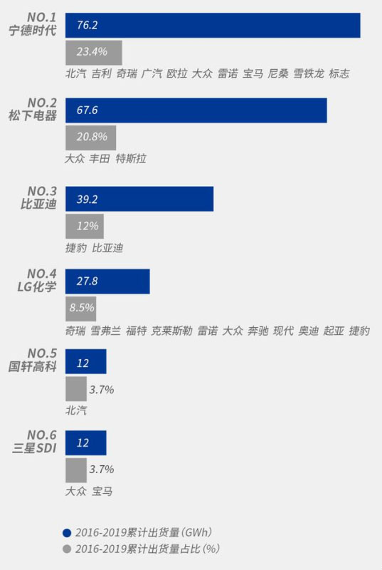 中國作為動力電池的第一生產(chǎn)大國,從2016至2019連續(xù)4年動力電池出貨量占據(jù)全球超過40%的市場份額,其中累積出貨量全球前五的企業(yè)中有三家來自中國,是名副其實的“世界充電寶”。2019年全球動力電池超過85%的出貨量和產(chǎn)能集中在中國、日本、韓國三國,形成東亞“三國鼎立”的市場布局。目前動力電池生產(chǎn)商第一梯隊,被寧德時代(中國)、松下電器(日本)、LG化學(xué)(韓國)等企業(yè)包攬全球前十強。