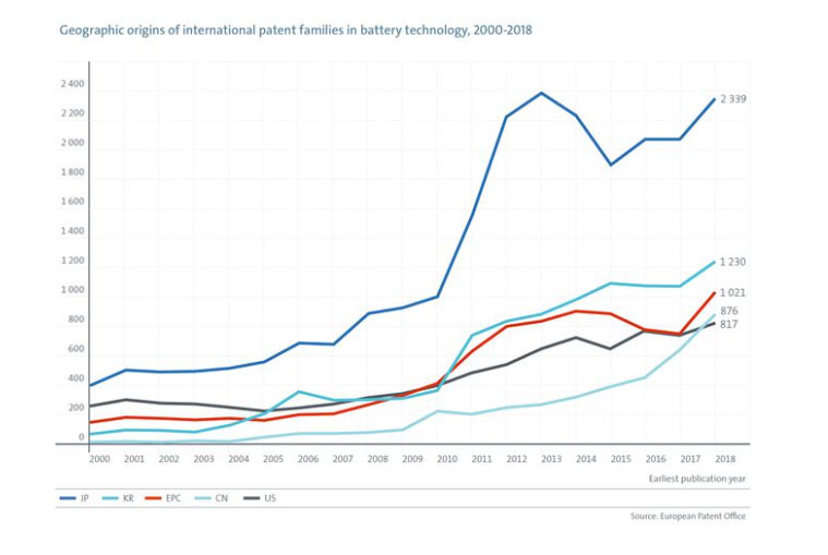 歐洲專利局與國際能源署近日發(fā)布的聯(lián)合報(bào)告顯示,2018年,日本提交的與電池相關(guān)的發(fā)明專利申請(qǐng)數(shù)量達(dá)到2339例,為全球最多,是第二名韓國1230例的約兩倍。
