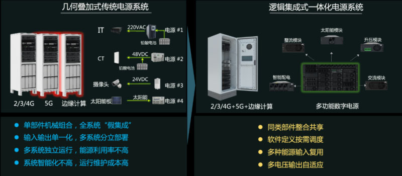 然而,作為通信設(shè)備供電保障的基石,電源系統(tǒng)20多年來(lái)未發(fā)生本質(zhì)變化——依然采用傳統(tǒng)的開(kāi)關(guān)電源加蓄電池的分立式架構(gòu)部署,機(jī)房占地空間大,多套系統(tǒng)獨(dú)立運(yùn)行,供電效率不高,智能化水平低,維護(hù)成本高。