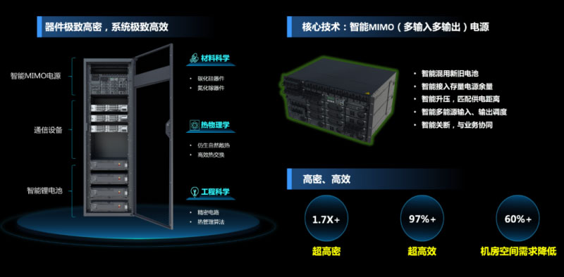 該產(chǎn)品的核心技術(shù)是智能MIMO(多輸入多輸出)電源,采用碳化硅、氮化鎵等小體積器件,仿生自然散熱技術(shù)以及數(shù)字精密電路工程技術(shù),實(shí)現(xiàn)了數(shù)字能源技術(shù),可智能調(diào)度多能源輸入/輸出、智能混用新舊電池、智能接入存量電源余量、智能升壓匹配供電距離,以及與業(yè)務(wù)協(xié)同實(shí)現(xiàn)智能關(guān)斷等。