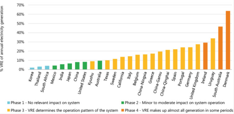 圖1 不同國家/地區(qū)波動性可再生能源發(fā)電占比及相應(yīng)的系統(tǒng)集成階段(2018年)